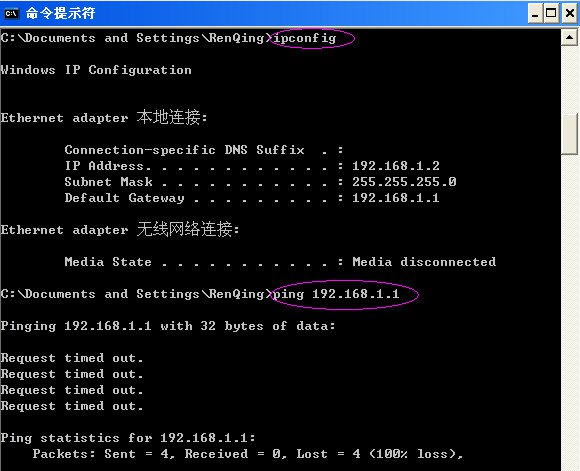 美国网件路由WGR614v5的默认登录IP是192.168.1.1,许多路由器品牌也将此值作为路由的默认登录IP,这样的话,一旦用户将两个设备连接到一起就会发生环路造成冲突,电脑仍能从路由器获得到IP地址,在DOS命令行窗口中使用ipconfig命令可查看获得的IP信息,但无法ping通路由器: